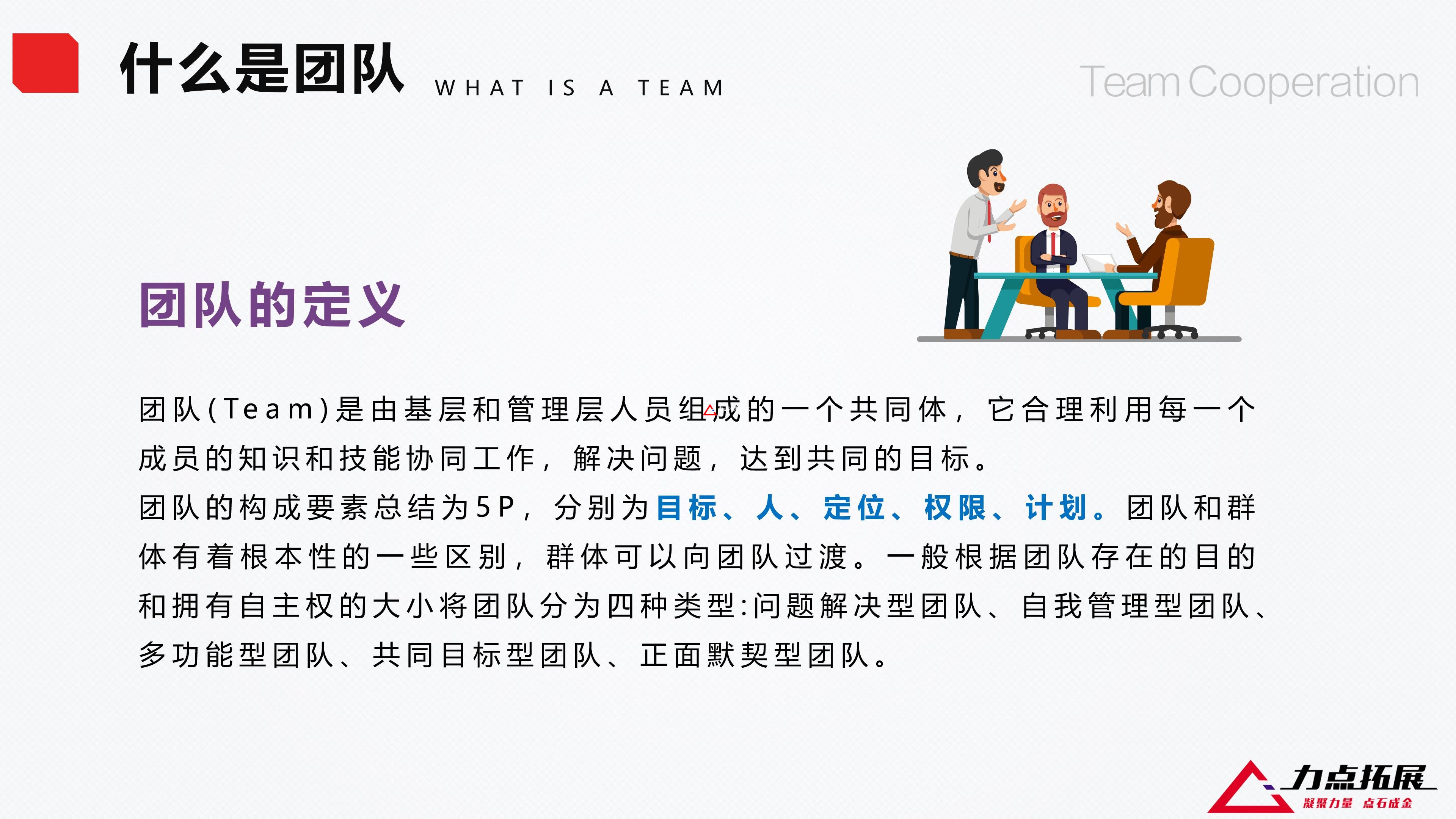 團(tuán)隊(duì)的構(gòu)成要素總結(jié)為5P,分別為目標(biāo)、人、定位、權(quán)限、計(jì)劃。團(tuán)隊(duì)和群體有著根本性的一些區(qū)別,群體可以向團(tuán)隊(duì)過渡。一般根據(jù)團(tuán)隊(duì)存在的目的和擁有自主權(quán)的大小將團(tuán)隊(duì)分為四種類型:問題解決型團(tuán)隊(duì)、自我管理型團(tuán)隊(duì)、多功能型團(tuán)隊(duì)、共同目標(biāo)型團(tuán)隊(duì)、正面默契型團(tuán)隊(duì)。